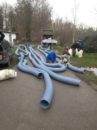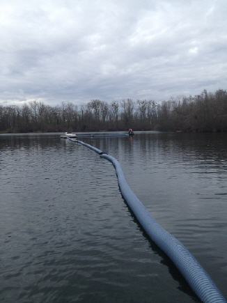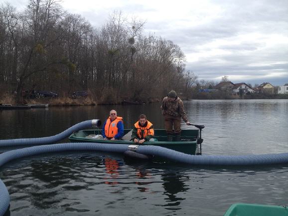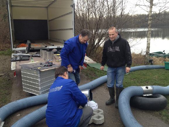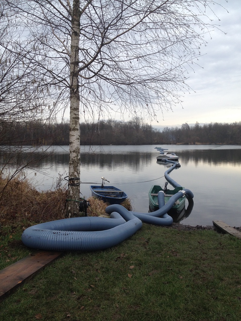 Endlich ist es soweit: Nach langen und zähen Verhandlungen mit der Stadt Kehl und den Technischen Diensten Kehl, wurde im Jahre 2013 eine Subvention der Umwälzpumpe von 50 % bewilligt. Die Anlage kostet 32000€. Davon trägt die Fischerzunft 16000€ und die laufenden Betriebskosten für Strom in Höhe von jährlich ca. 300 €. Die Anlage hat 2 Motoren mit jeweils 80 Watt. Die Ansaugschläuche haben eine Länge von 80 Meter und 60 Meter von denen aus vom Gewässerboden das sauerstoffarme Wasser aus der Tiefe nach oben gepumpt wird. An der Oberfläche vermischt es sich mit dem sauerstoffreichen Wasser und zirkuliert wieder zurück Richtung Gewässerboden und reichert somit den unteren Bereich mit Sauerstoff an. Aufgrund der Anreicherung kommt es durch die wieder einsetzende Oxydation zu einem Schlammabbau und zur Verbesserung der Lebensbedingungen für Fische und Pflanzen.